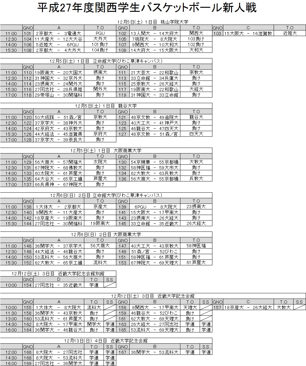 平成27年度関西学生バスケットボール新人戦 タイムスケジュール