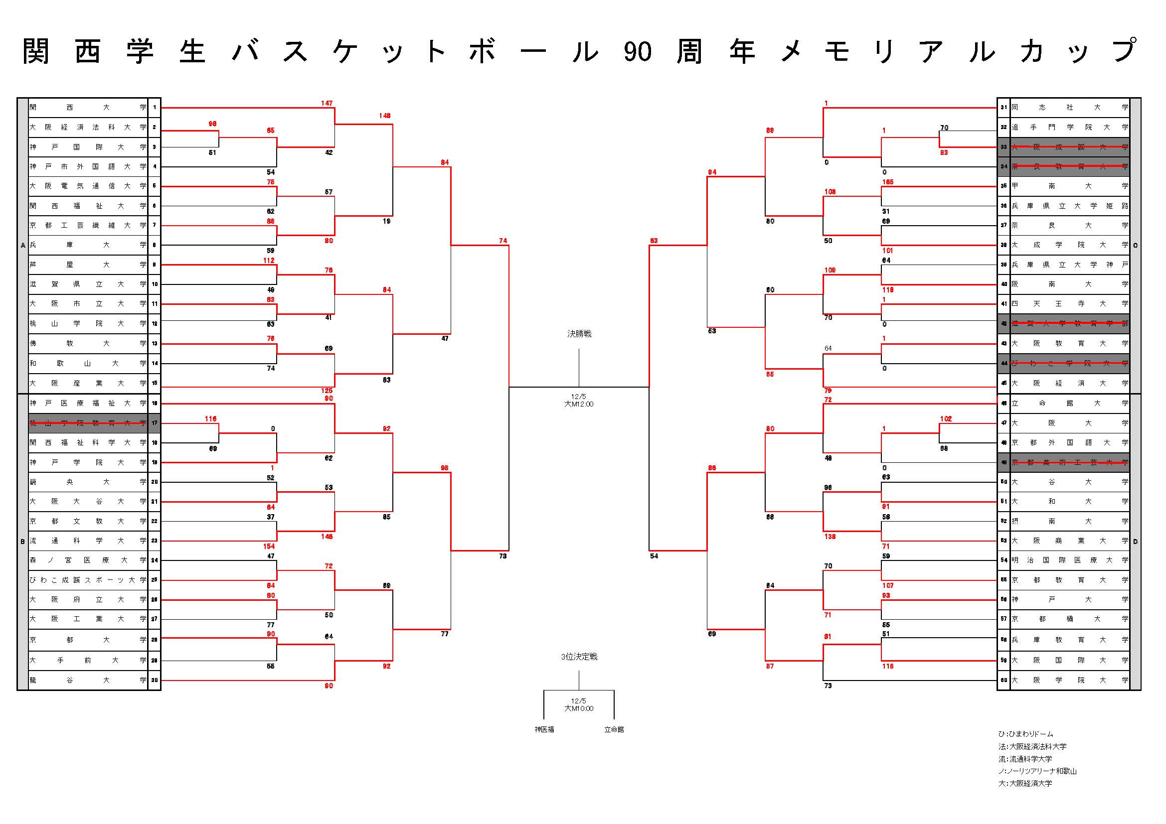 | 32 | 13:15 | ●大和大学 vs 大阪商業大学○ | 20-31 | 28-51 | 28-33 | 20-23 | 96-138 | BOX | |