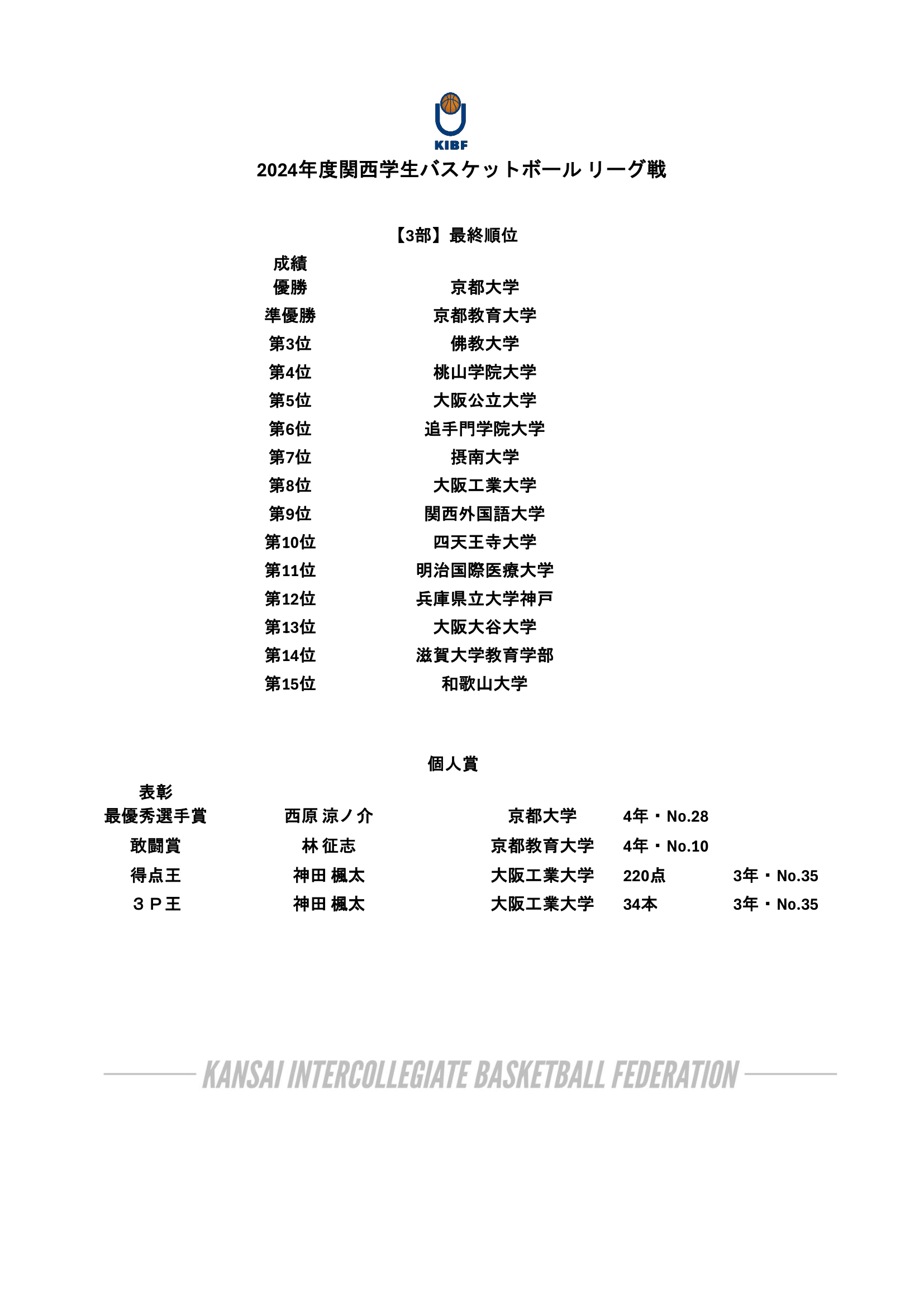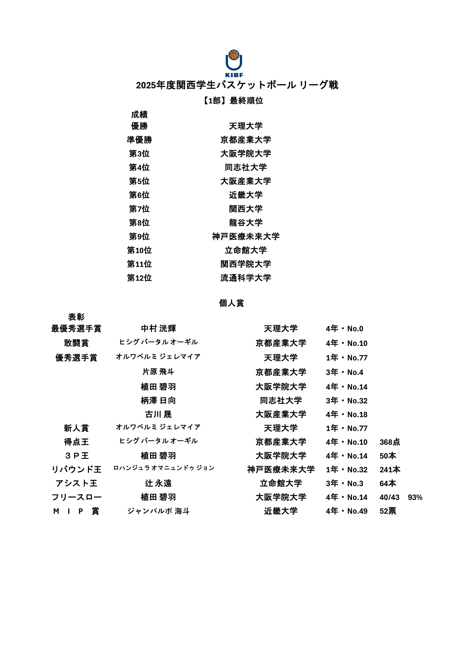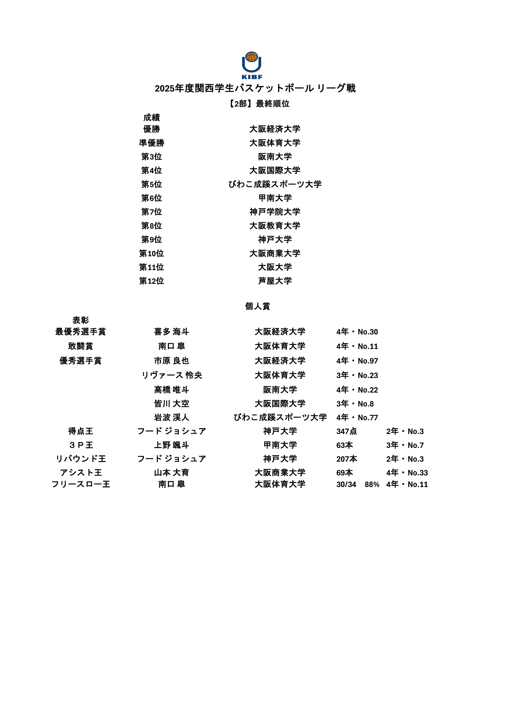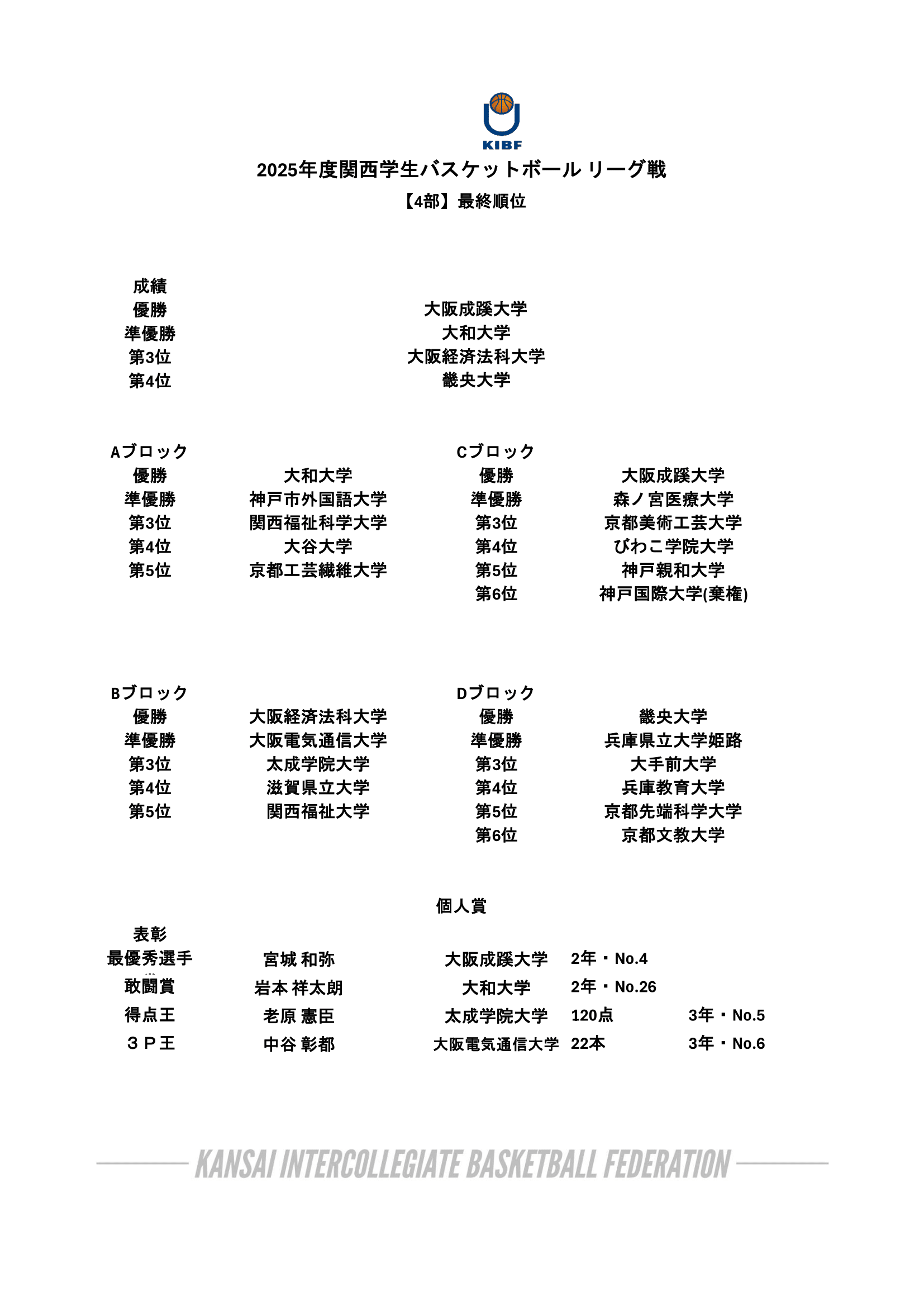 【リーグ戦】最終結果について 2025年度関西学生バスケットボールリーグ戦 2025.11.04 2025年度 関西学生バスケットボール リーグ戦1~4部全ての試合が終了いたしましたので、最終結果をお知らせいたします。
