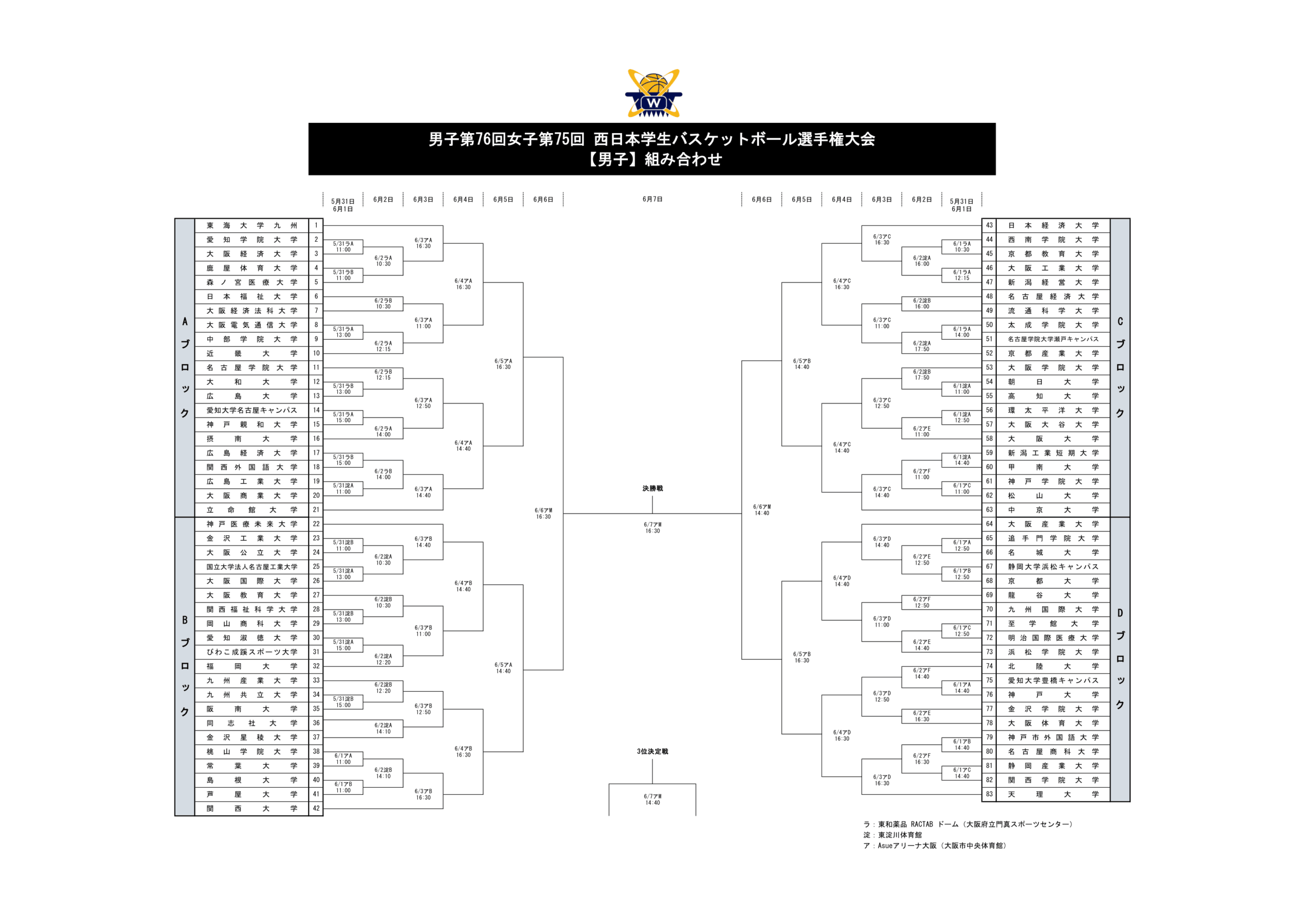 男子第76回女子第75回西日本学生バスケットボール選手権大会の開催にあたりまして、【男子】タイムスケジュールとトーナメント表を公開いたします。