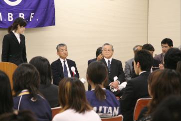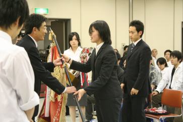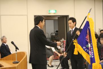 愛知学泉大よりデイリー松尾事業部長へ優勝旗返還